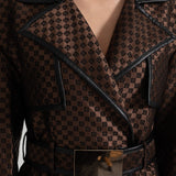 Brown Wide Lapel Jacquard Trench Coat With Gold Buckle Waist Belt