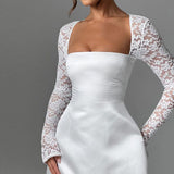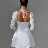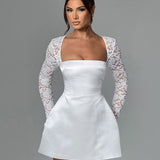 Short satin dress with lace sleeves in A-line style