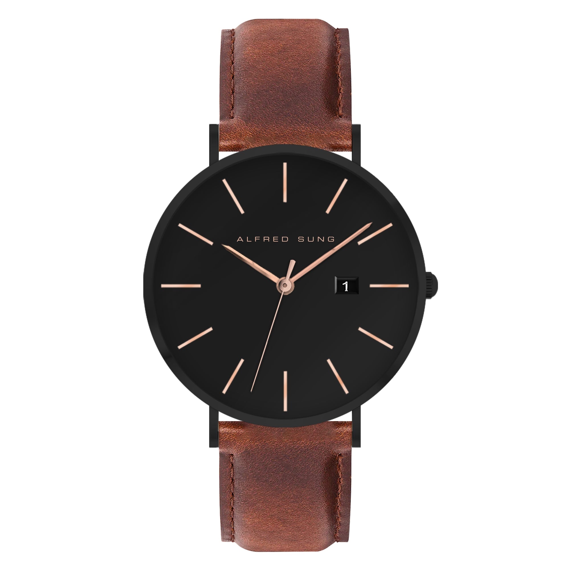 Elegant Style – Sleek and modern design with a minimalist black dial, perfect for both casual and formal occasions, showcasing Alfred Sung's commitment to timeless elegance.