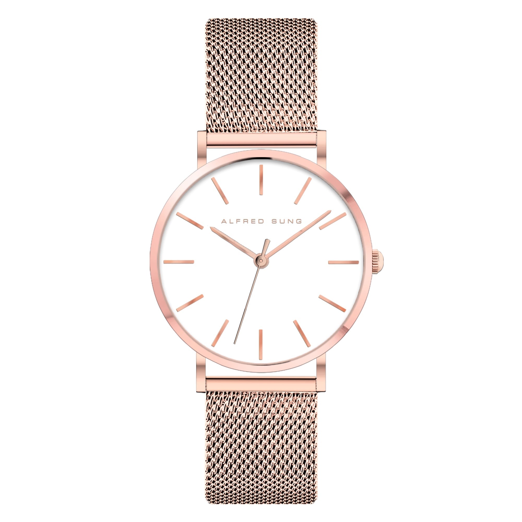 Elevate your style with the Alfred Sung Muse Ladies Wristwatch. This exquisite timepiece features a 36mm round rosegold case and a matching stainless steel bracelet, exuding elegance and sophistication. The pristine white dial is powered by precise Japanese movement, ensuring reliability and accuracy. Perfect for any occasion, this watch seamlessly blends classic aesthetics with modern design, making it a must-have accessory for those who appreciate enduring sophistication.