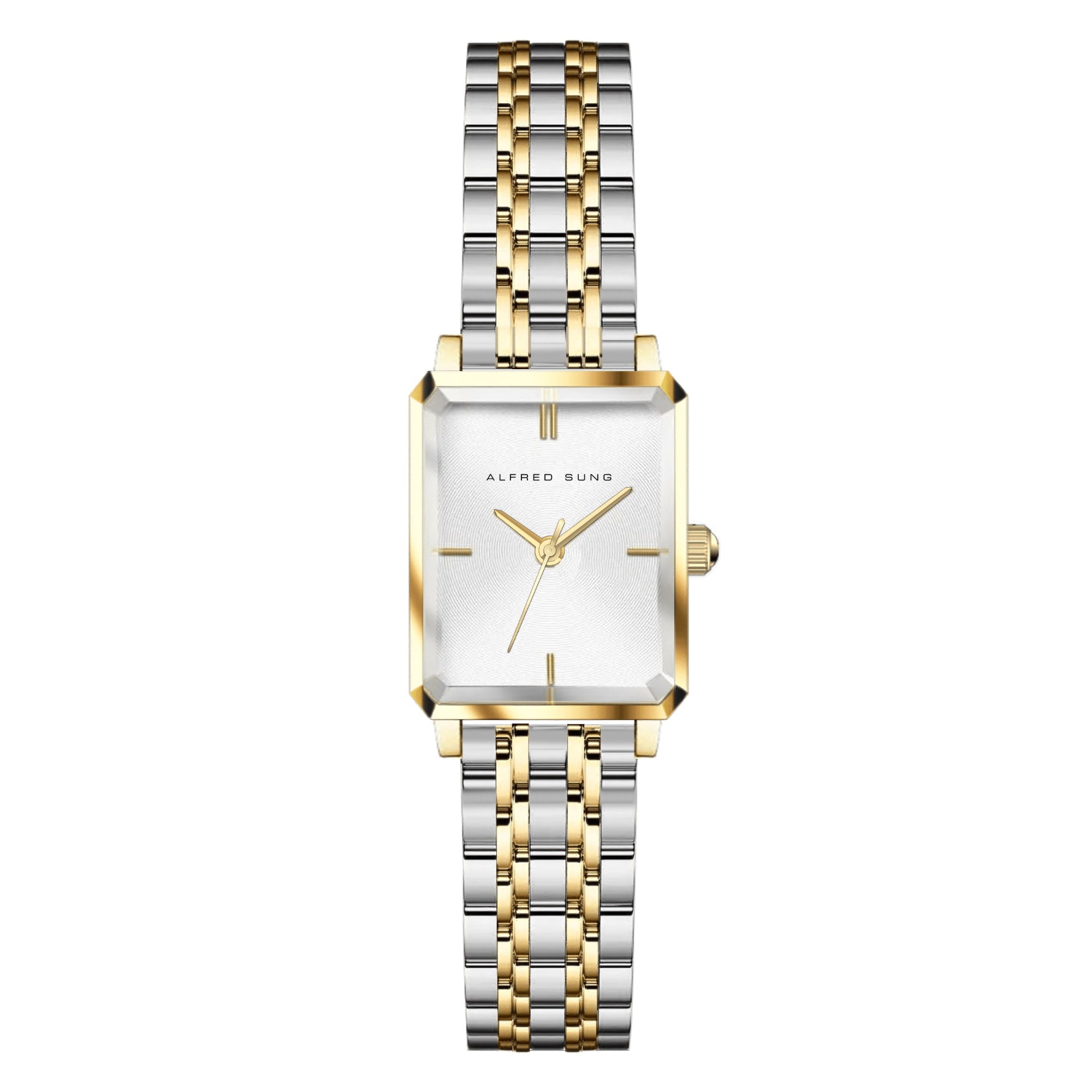 Elevate your elegance with the Alfred Sung Octavia Ladies Wristwatch. This exquisite timepiece features a gold case and a dual-tone stainless steel bracelet, embodying timeless sophistication. The white dial, powered by precise Japanese movement, ensures reliable timekeeping. Perfect for any occasion, the Octavia watch is a testament to refined style and enduring quality.