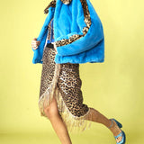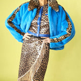 Blue and Leopard Print Faux Fur Coat
