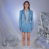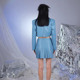 College Style Blue Vegan Faux Leather Cropped Jacket