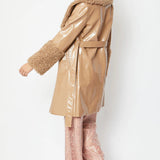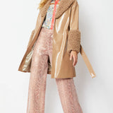 Mocha Faux Leather Trench Coat with Faux Shearling Collar and Cuffs