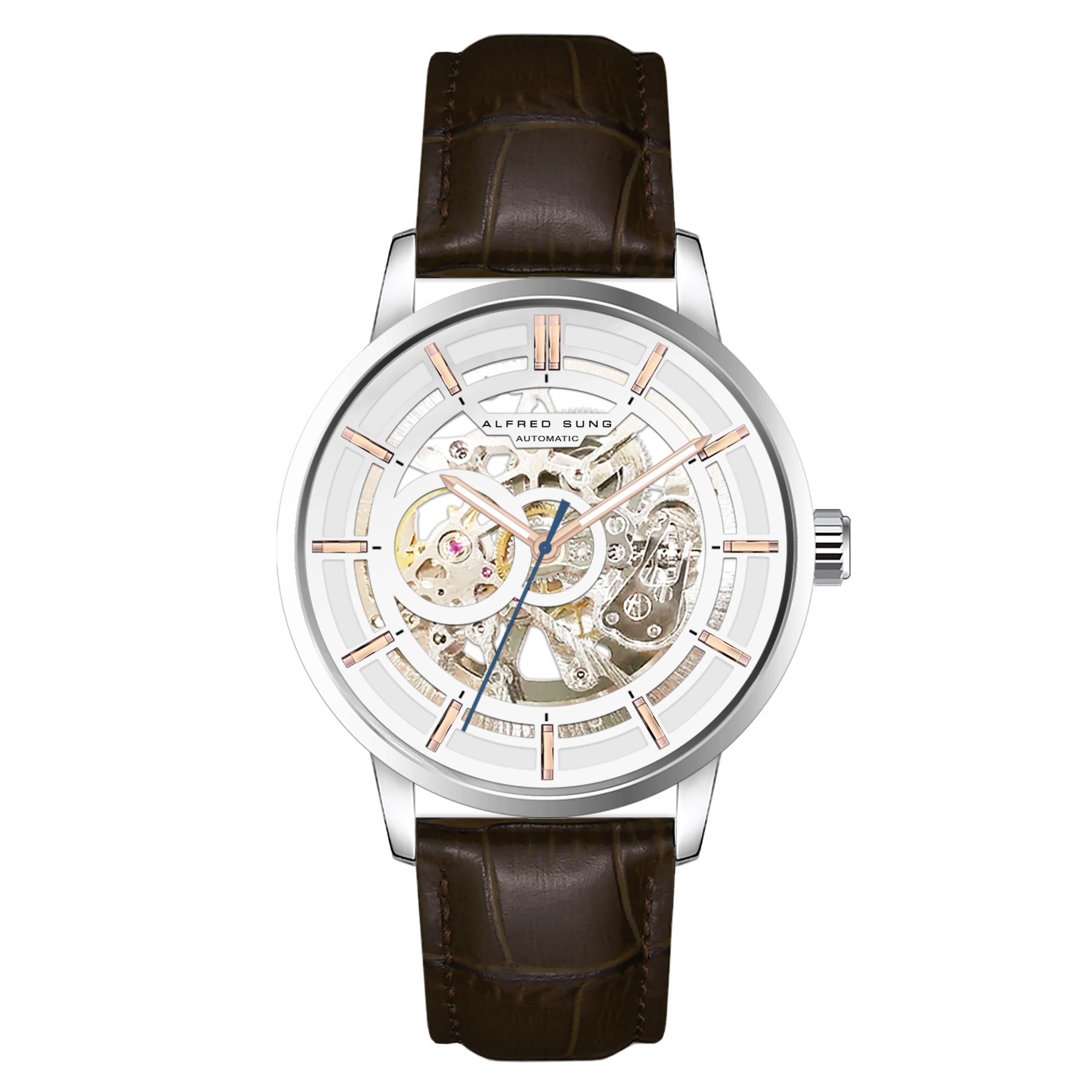 Alfred Sung Automatic III White Skeleton Dial Brown Leather Strap Men's watch
