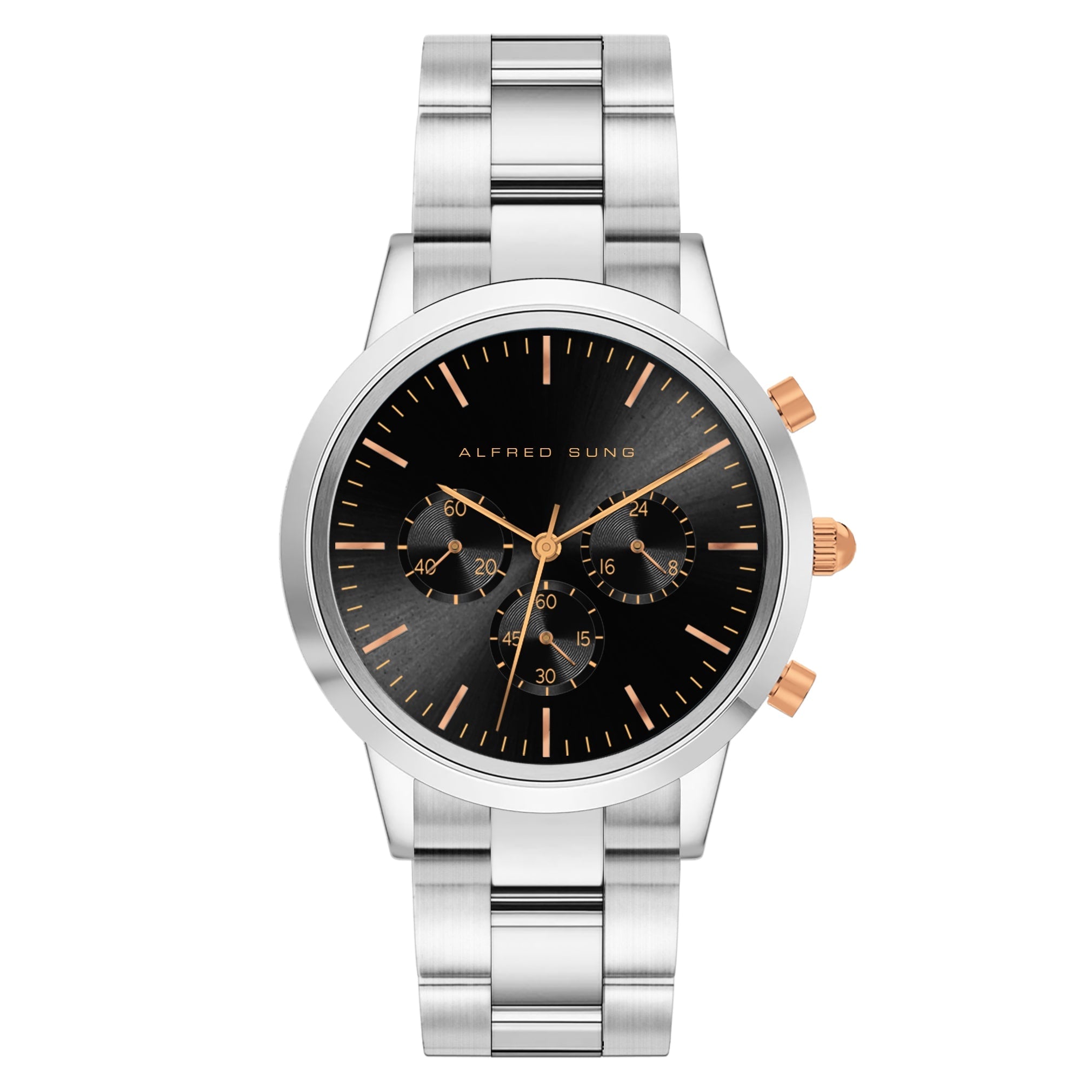 Elevate your style with the Alfred Sung Men's Chronograph Wristwatch. This exquisite timepiece features a sleek 42mm silver case and a sophisticated black sunray dial, perfectly complemented by a silver stainless steel bracelet. The chronograph functionality, sub-dials, and Japanese movement ensure precision and reliability, while the slim design adds a touch of modern elegance. Ideal for those who appreciate timeless sophistication, this watch is a true testament to Alfred Sung's dedication to quality and style.