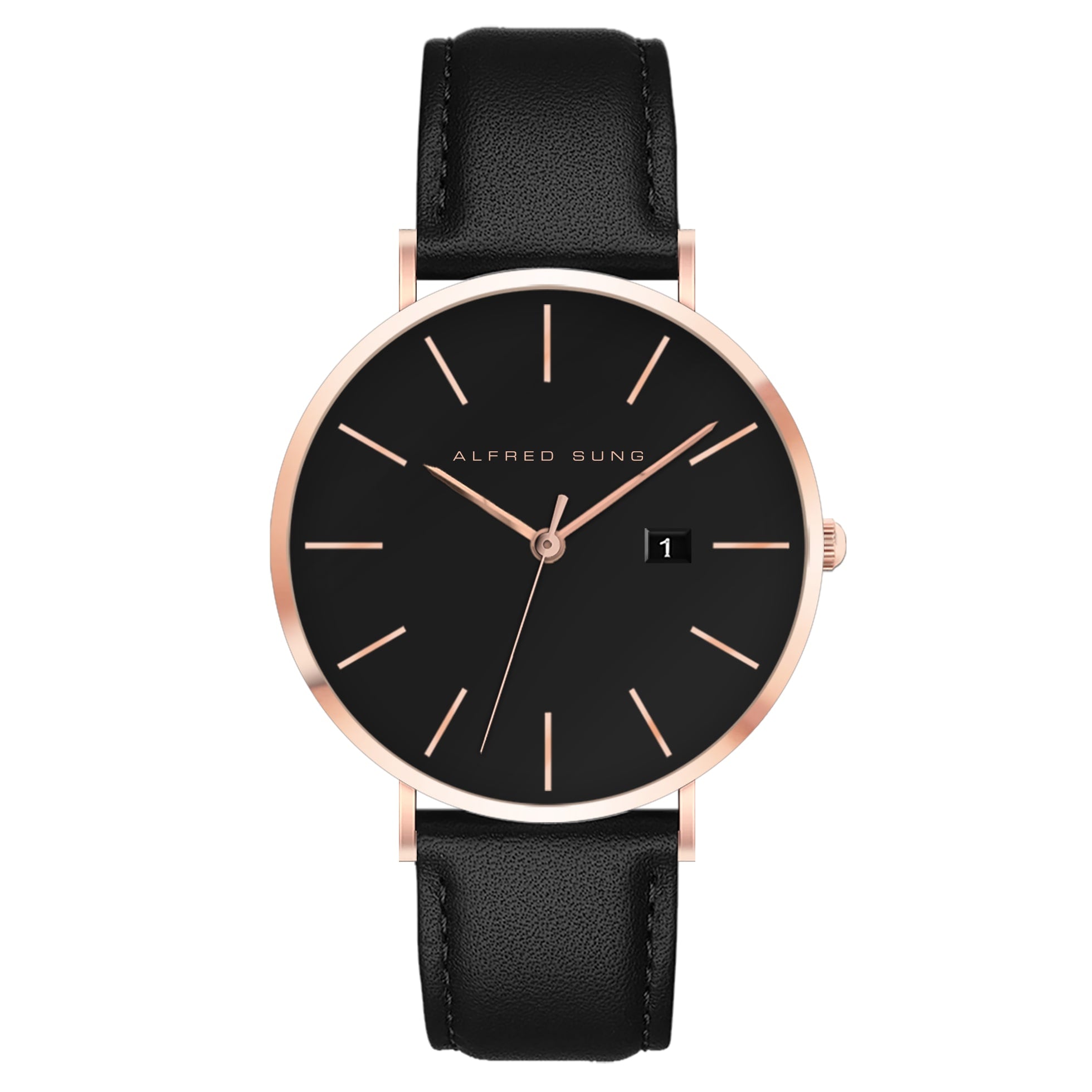 Elevate your style with the Alfred Sung Metropolitan Men's Wristwatch. This exquisite timepiece features a 42mm round rosegold case, perfectly complemented by a sleek black dial and a luxurious black Italian leather strap. The slim design and interchangeable strap offer versatility, while the date function adds practicality. Crafted with precision and elegance, this watch is a testament to Alfred Sung's dedication to timeless sophistication and modern design.
