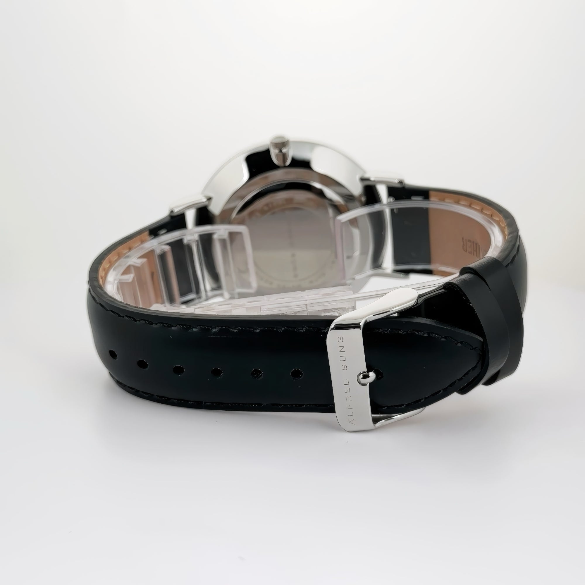 Alfred Sung Men's Metropolitan Collection wristwatch is a timeless piece that embodies sophistication and elegance. With a sleek 42mm silver case and a luxurious black Italian leather strap, this watch is designed for the modern man who values both style and functionality. The black sunray dial adds a touch of refinement, while the interchangeable strap feature offers versatility. Perfect for any occasion, this watch is a testament to Alfred Sung's commitment to quality and design.