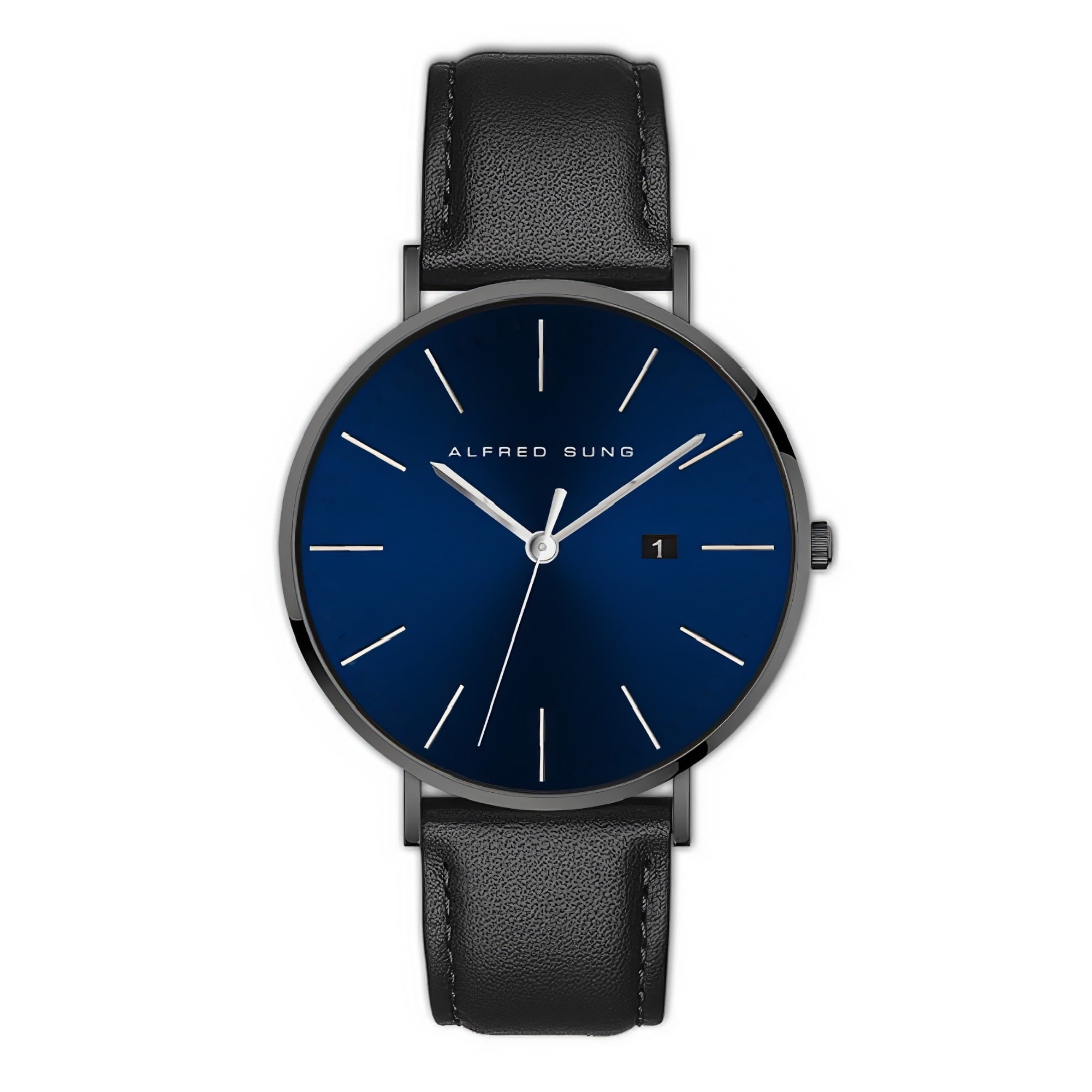 Alfred Sung Metropolitan Date Blue Dial Silver Case Black Leather strap watch