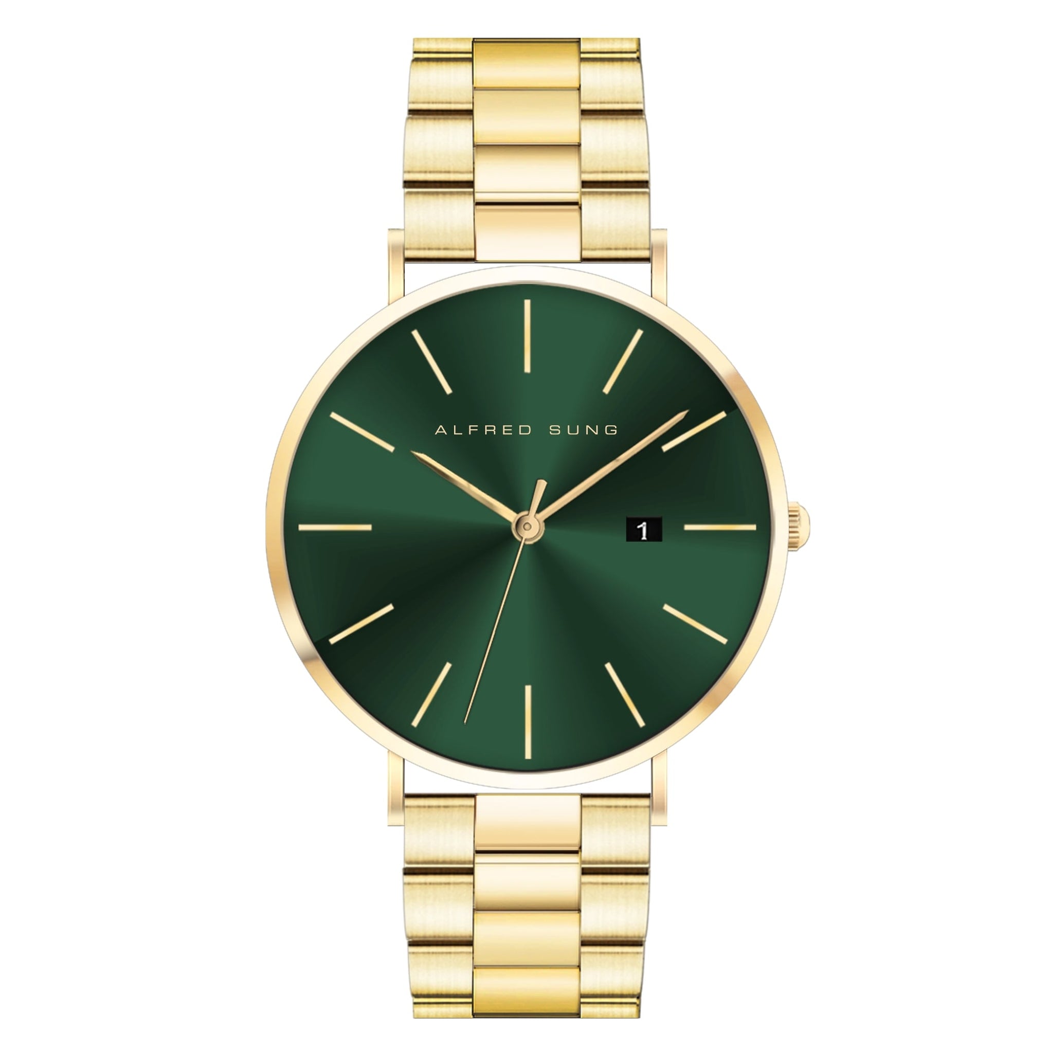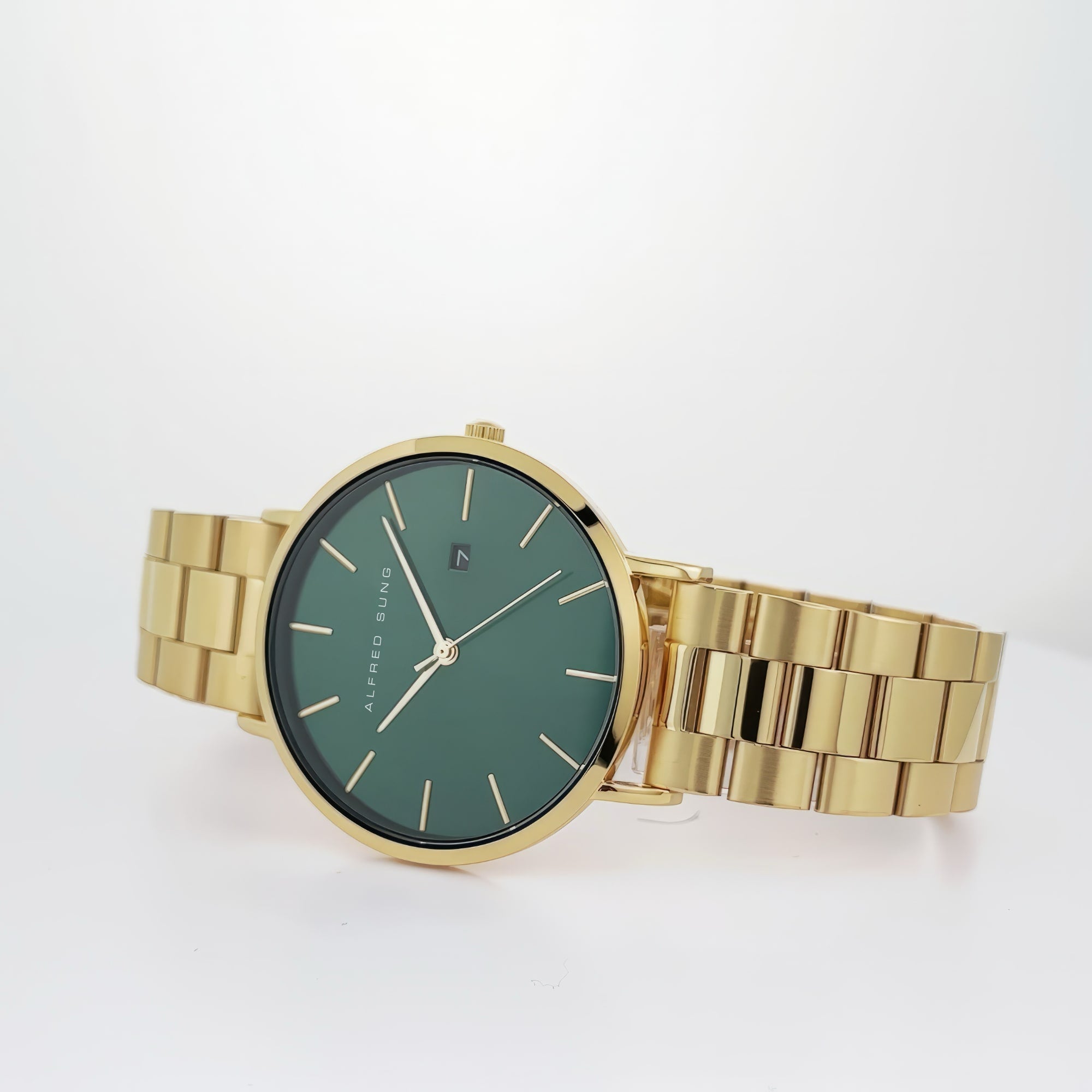 Alfred Sung Metropolitan Date Green Dial Gold Bracelet watch
