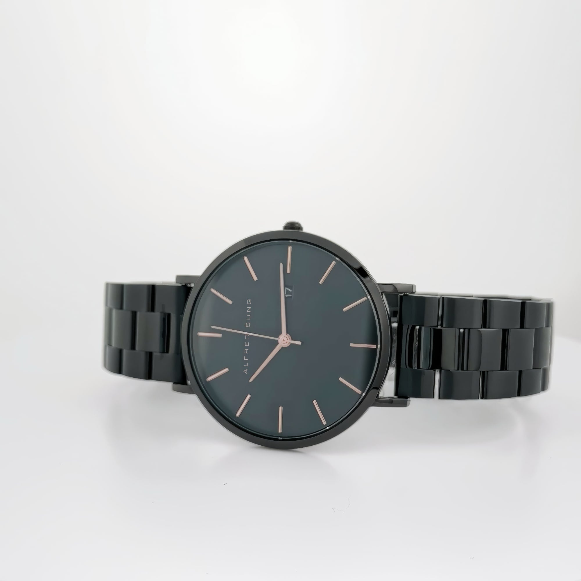 Elevate your style with the Alfred Sung Metropolitan Men's Wristwatch. This exquisite timepiece features a sleek black gunmetal case and a matching stainless steel bracelet, embodying modern sophistication. The slim design and black dial with date function make it a versatile accessory for any occasion. With an interchangeable bracelet, this watch offers both elegance and functionality, perfect for the discerning gentleman.