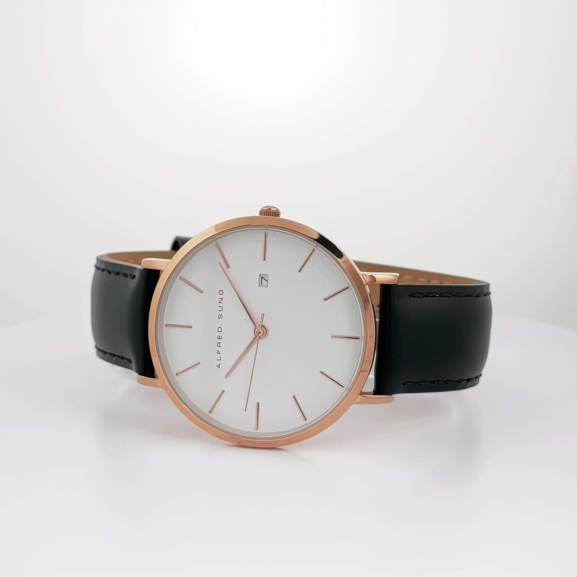 The Alfred Sung Metropolitan Men's Wristwatch is a timeless piece that embodies sophistication and modern elegance. Featuring a 42mm rosegold case, a sleek white dial, and a luxurious black Italian leather strap, this watch is designed for the discerning gentleman. Its slim profile and interchangeable strap offer versatility, while the date function adds practicality. Perfect for any occasion, this watch seamlessly blends style and functionality, making it a must-have accessory for those who appreciate classic aesthetics.
