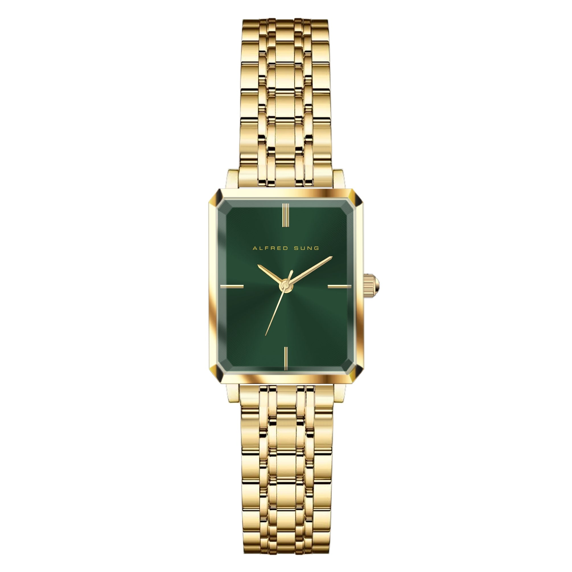 Elevate your style with the Alfred Sung Octavia Ladies Wristwatch. This exquisite timepiece features a gold square case and a luxurious gold stainless steel bracelet, perfectly complemented by a captivating green sunray dial. Powered by precise Japanese movement, this watch is a harmonious blend of elegance and functionality. Ideal for those who appreciate timeless sophistication, the Octavia collection embodies the essence of modern classic design.