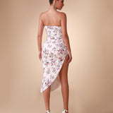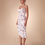 Elegant and sophisticated floral patterned satin strapless dress