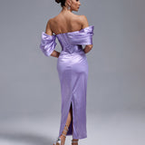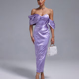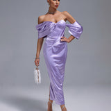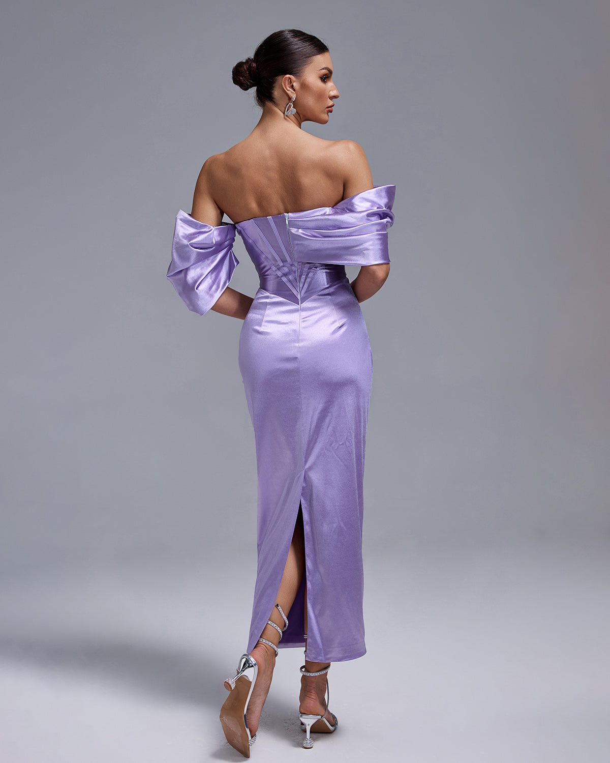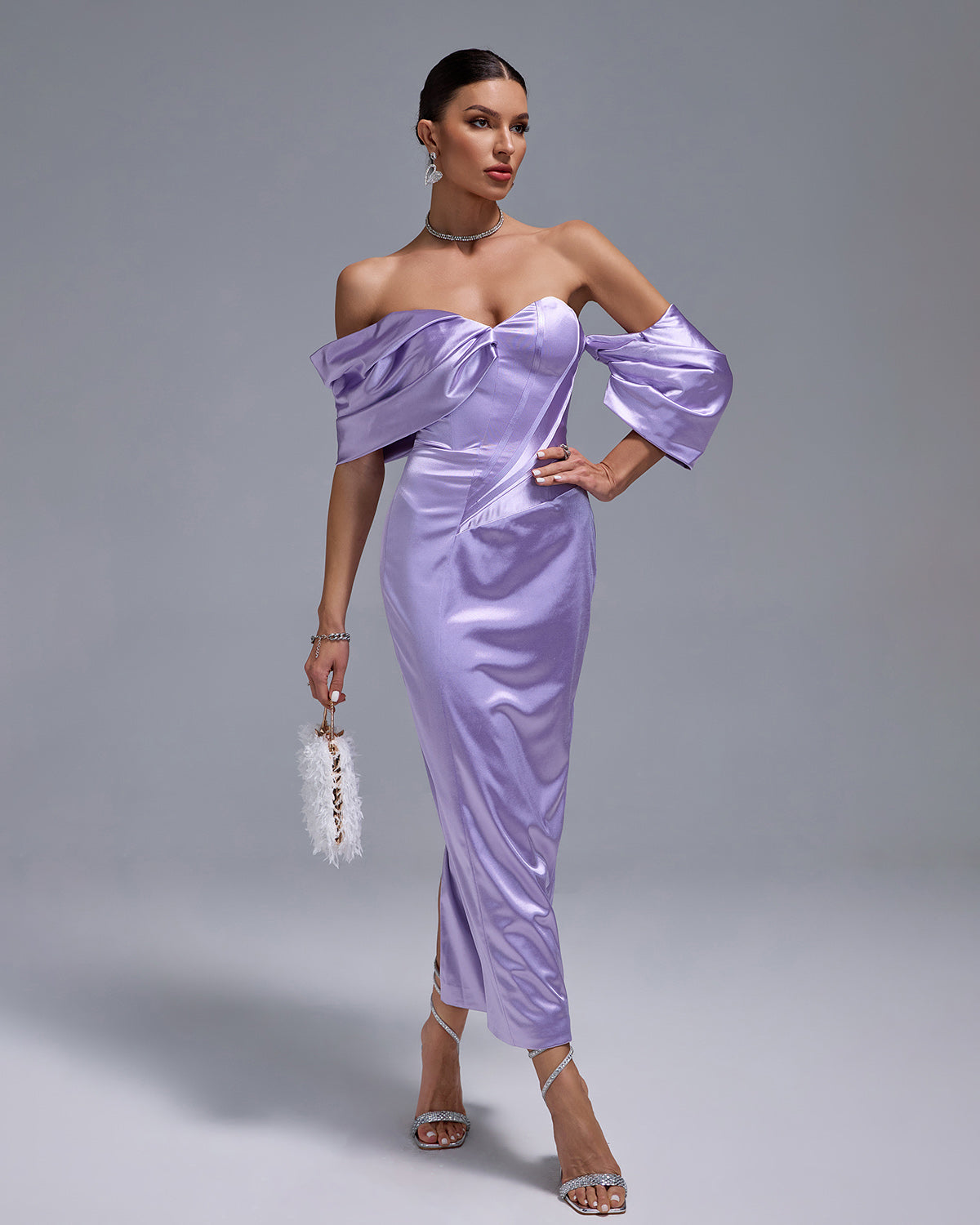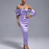Elegant Lavender Satin Dress with Shoulder-Free Design and Mid-Length
