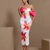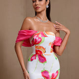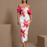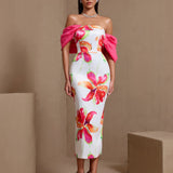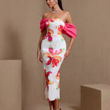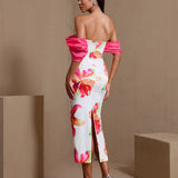 Off Shoulder Printed Matte Satin Dress