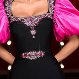 Puff Sleeve Patchwork Crystal Bandage Dress
