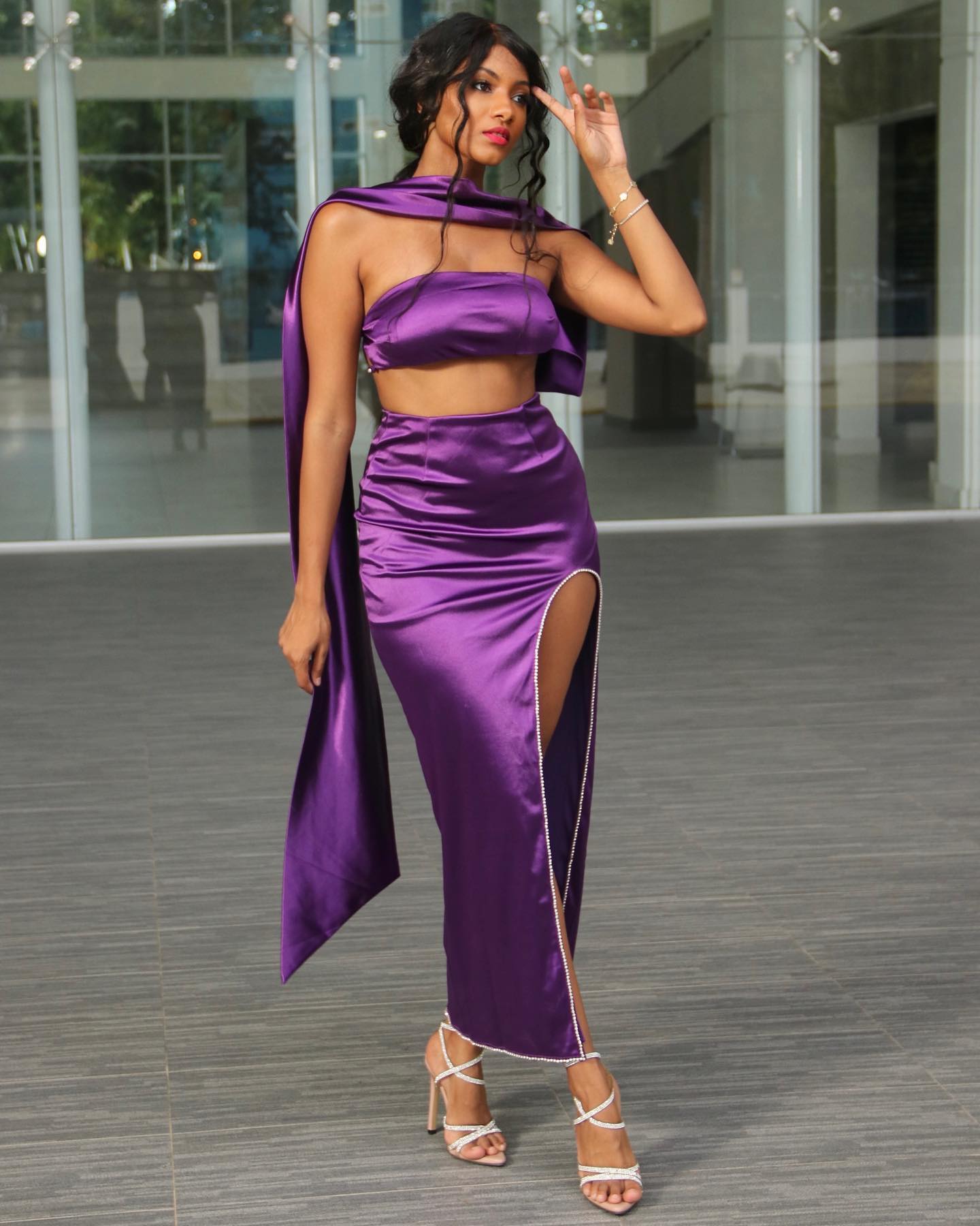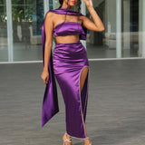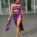 Elegant Purple Satin Strapless Gown with a Stunning Sash