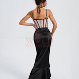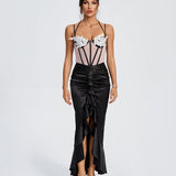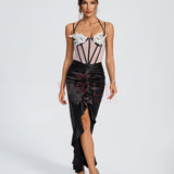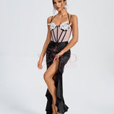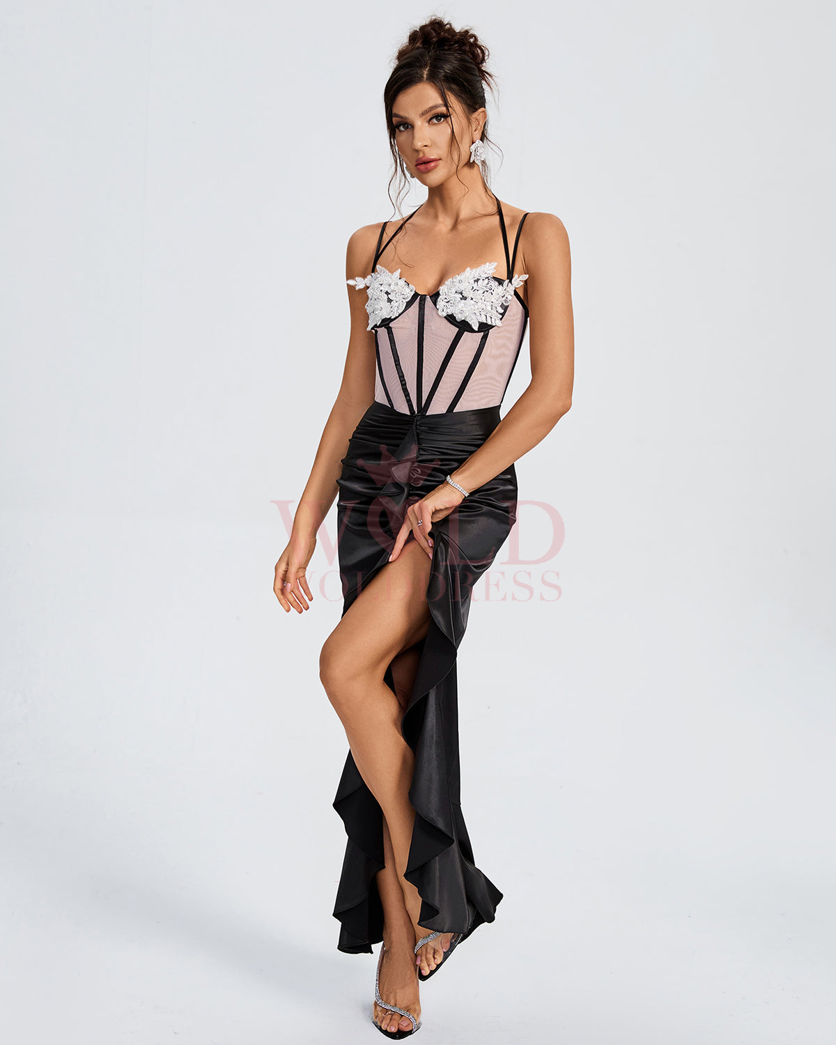 Ruffle Satin Corset Floral Wing-Design Dress with Cups