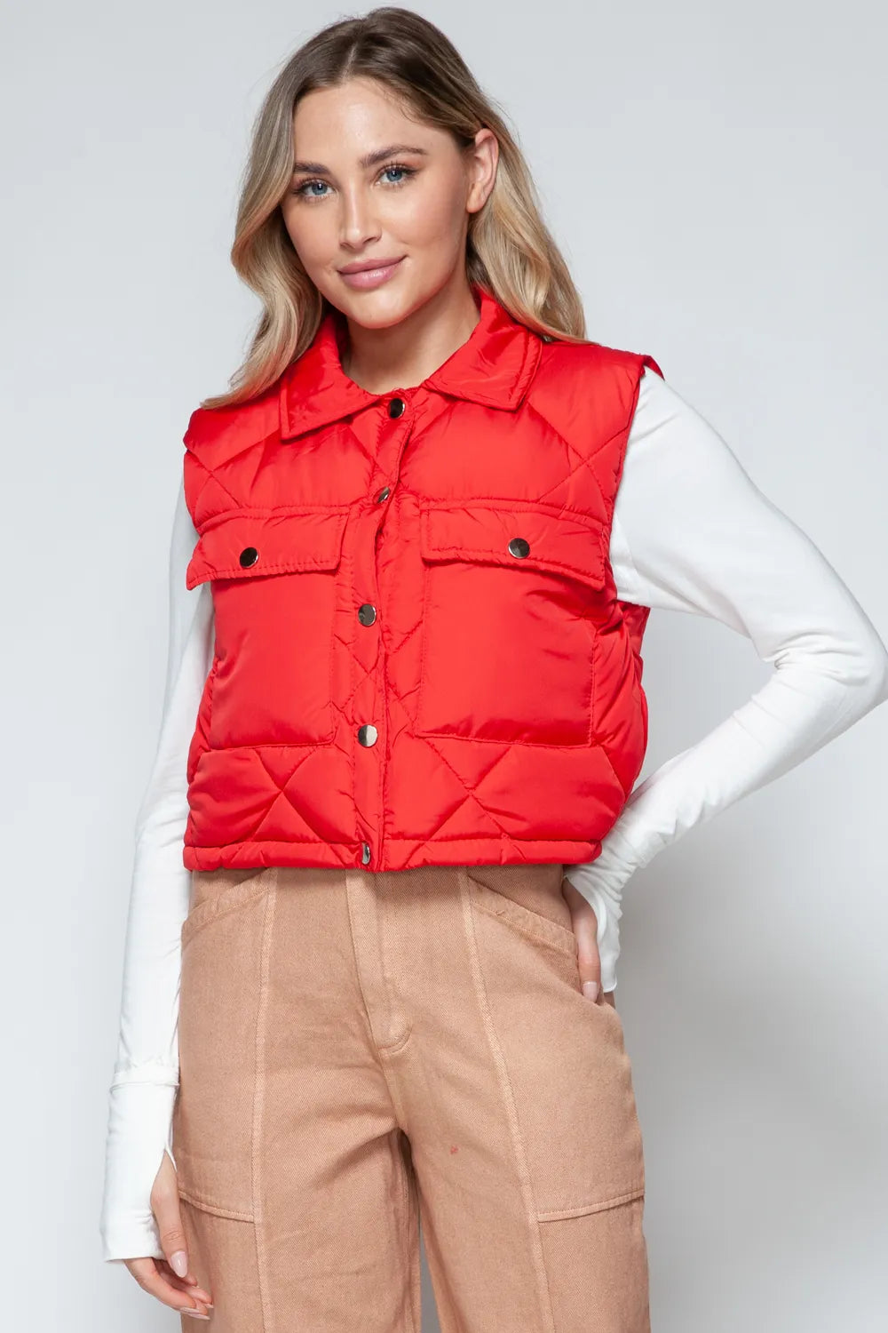 The snap-down quilted crop vest is a stylish and versatile addition to your wardrobe. With its snap-button closure and cropped length, this vest offers a modern and edgy look. The quilted design adds texture and interest to the vest, perfect for layering over tops or dresses. Featuring a flattering cropped silhouette, this vest is great for adding warmth and style to your outfits. Stay on-trend and cozy with this chic snap-down quilted crop vest, ideal for both casual and dressed-up occasions. Elevate your look with this fashionable and functional piece that will keep you stylish all season long!