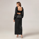 Two-Piece Satin Set with Square Collar Backless Design Draped and Elegant Slit