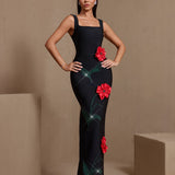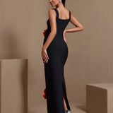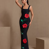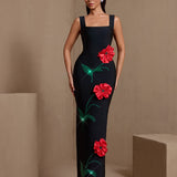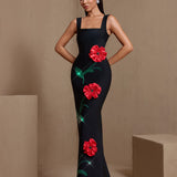 Square Neck Red Flowers Bandage Dress